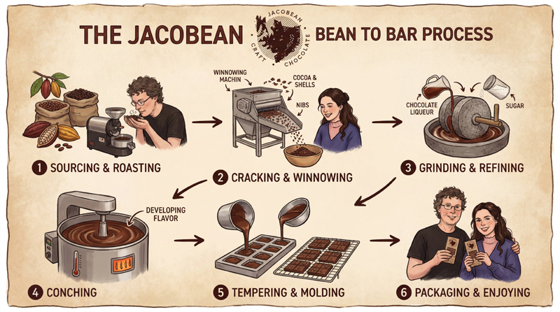 Here at JACOBEAN Craft Chocolate, we begin with sourcing the finest organic Cacao Beans from around the world. Our single origin beans are nurtured through a 12-step/20-day process to bring out the individual flavours and nuances of each bean profile.